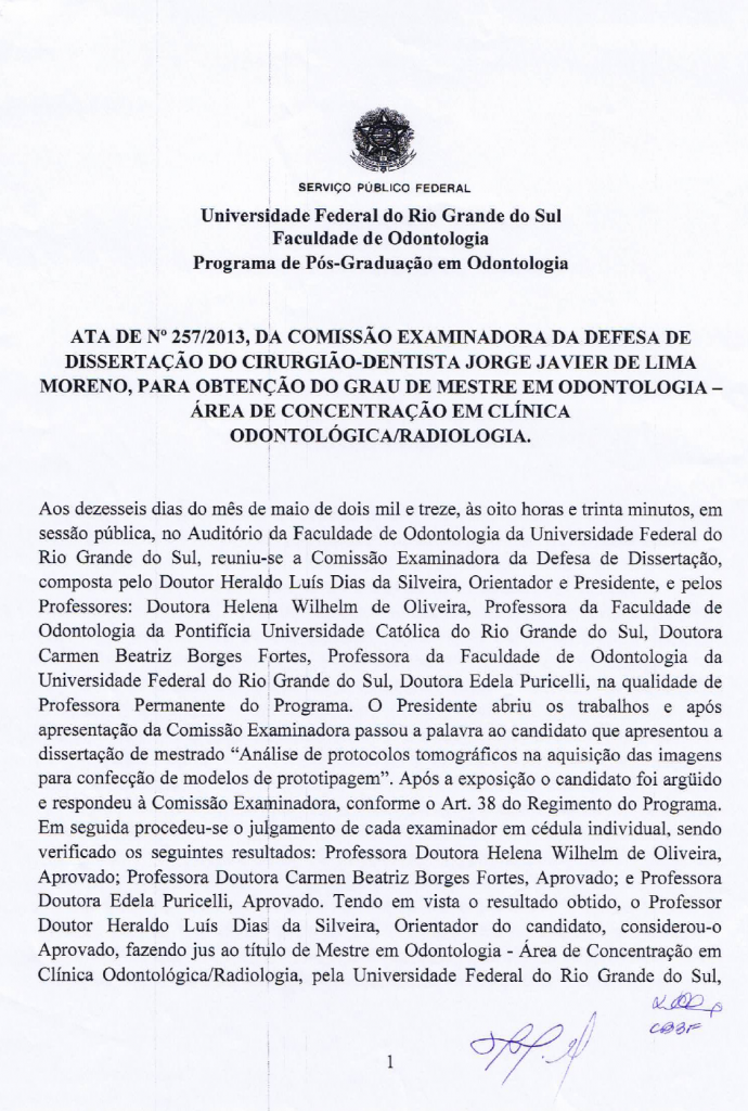 El 19 de Mayo (2013) ,dentro del programa de educación de post grado de la Facultad de Estomatología de la Universidad de Río Grande del Sur (Porto Alegre -Brasil) ; el Dr. Javier de Lima Moreno ,recibió su diploma de Maestría en Clínica Odontológica y Radiológica con el trabajo :